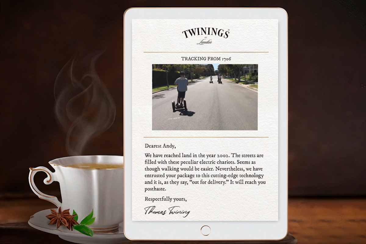Tracking packages has never been anything but cold and systematic. Twinings wanted to evolve this dull technology by being the first company to leverage the tracking system to build brand love. We did this by launching “Tracking from 1706”. A revolutionary new approach to tracking that allows customers to track their package from the year 1706, to their doorstep in the year of 2020, making several fun stops along the way.